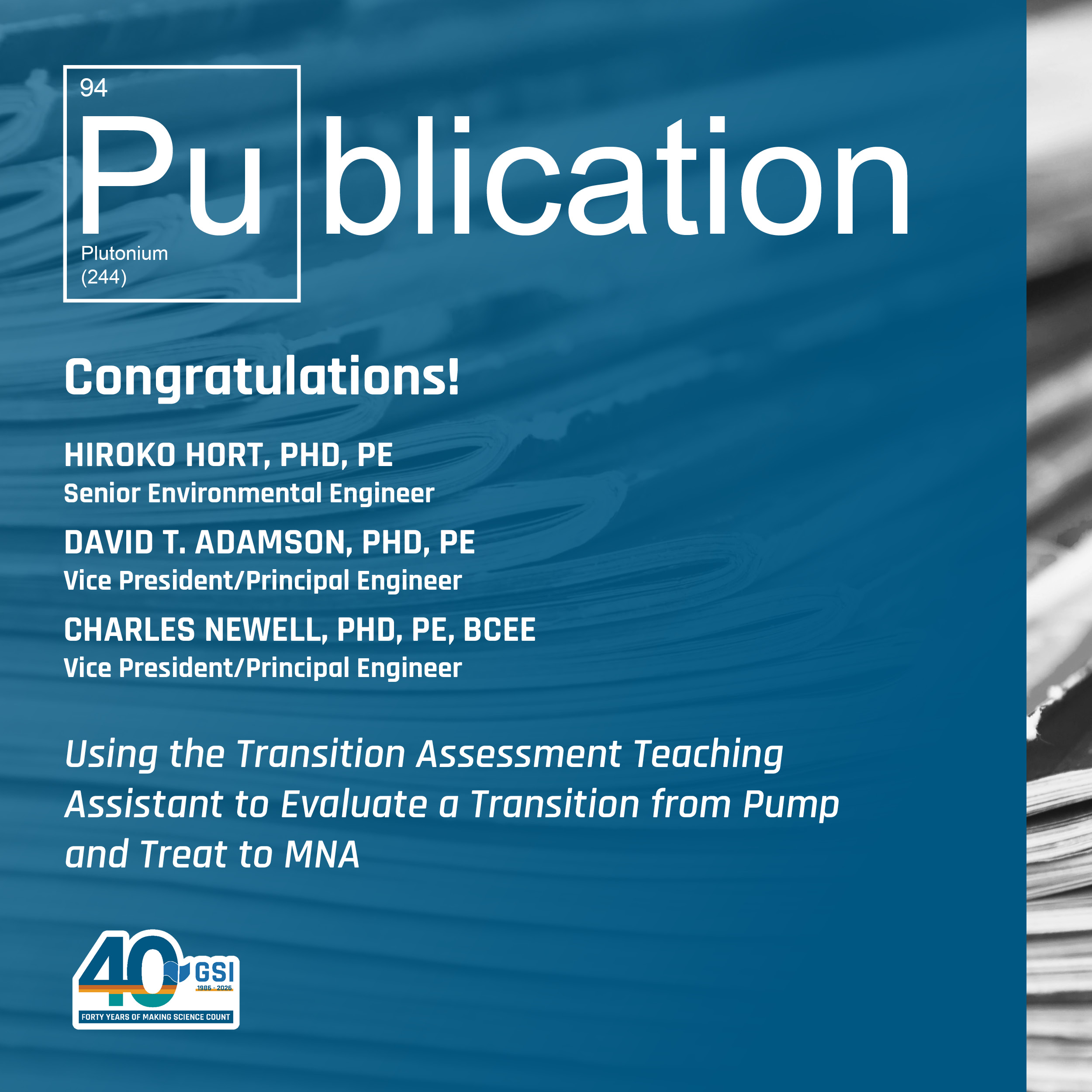 This anniversary milestone belongs to the people who made it possible. Thank you to our clients, employees, and partners who have shaped GSI over the past four decades through trust, expertise, and shared commitment. Throughout 2026, we’re celebrating the work, the relationships, and the impact that defines our work. And as we look forward, we remain committed to delivering sound science, practical insight, and solutions designed to stand the test of time.