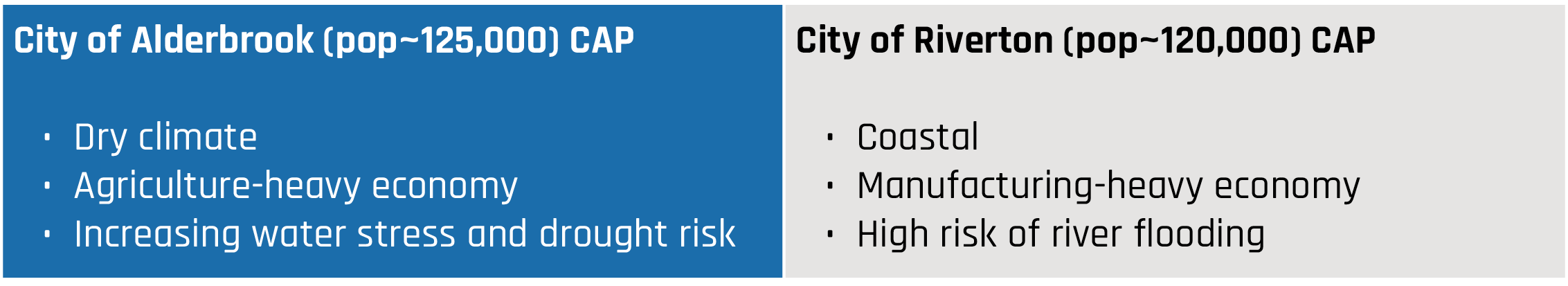 The examples below compare two similarly sized fictional municipalities at different stages of maturity. One is developing its first CAP, while the other is updating its CAP to a CAAP to plan and implement adaptation and resilience actions. By comparing their approaches, we can highlight how the process adapts to each community’s needs and circumstances.